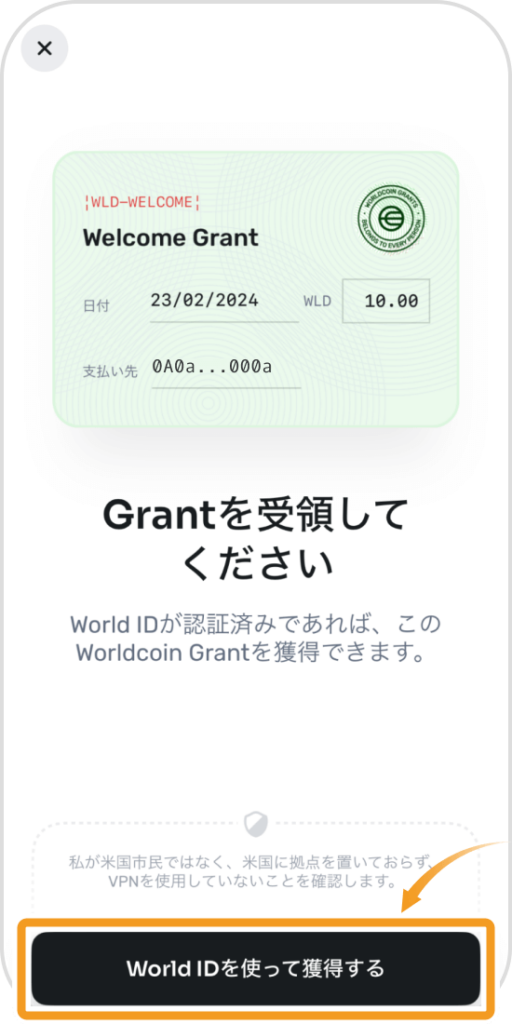 WLDの受け取り方法は簡単で、アプリ内の「Grant獲得」ボタンをタップするだけです。