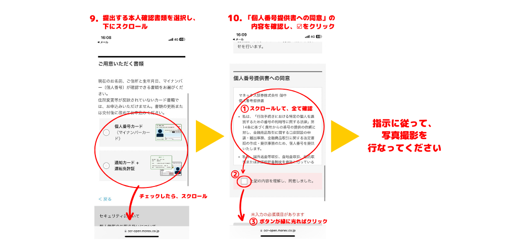 9. ご用意いただく書類で、「個人番号カード」もしくは「通知カード・運転免許証」のどちらかにチェックを入れ、下にスクロール