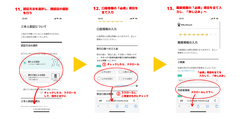 11. ご本人認証について、認証方法の選択の「顔による認証」もしくは「銀行口座による認証」にチェックを入れ、下にスクロール